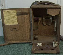 coffret bois, bretelles cuir poignée gainée cuir crochets laiton trépied Sanguet vis à pompe nivelles de lunette et cavalière bouchon d'objectif pare-soleil tourne-vis burette graisse tenseur de fil à plomb |