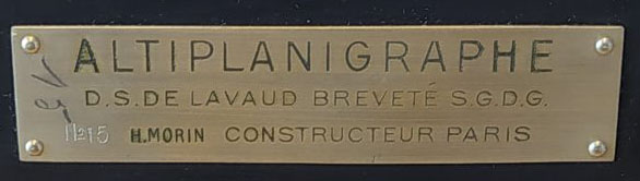 La plaque indique ALTIPLANIGRAPHE D.S. DE LAVAUD BREVETE S.G.D.G. E. RAVISÉ CONSTRUCTEUR PARIS
