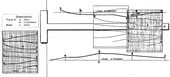 Figure 10. Reconstitution du tracé total (Planimétrie). Outre le " procédé courant " avec la collaboration d'un aide, nous avons déjà mentionné le " procédé à fil perdu " qui permet de lever rapidement le cours d'une rivière sans être obligé d'en suivre les bords ou de lever très rapidement un itinéraire sans s'occuper du profil du terrain. La bobine de fil est crochée aux côtés de la caisse et de là le câble s'enroule sur la poulie de commande pour aller ensuite se " perdre " le long du cheminement. Au début on l'aura attaché à un point quelconque situé près du point de départ, puis on le laisse se développer en s'accrochant aux aspérités des rives et du sol ou en se posant sur l'eau. Le procédé à " fil perdu " est essentiellement économique malgré qu'il faille sacrifier le fil. Il permet l'enregistrement approximatif du profil parcouru et de plus est très rapide, la vitesse de cheminement atteignant 5 kil. à l'heure. L'exactitude du levé est approximativement de 1 : 500. A. A. L'ALTIPLANIGRAPHE D. S. de LAVAUD livre de F. CAMPS 1921 179 rue de la Pompe Paris XVIe