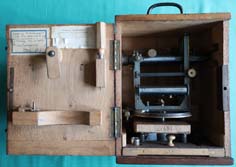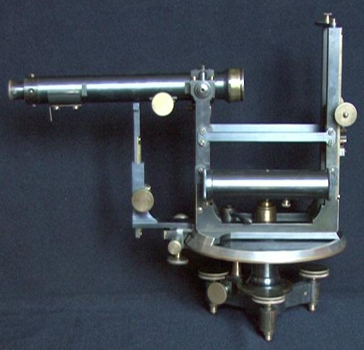 laiton h totale 290 mm, h = 0,225 lunette l = 175 mm à basculement, objectif diam. = 20 mm cercle diam. 125 mm 400 grades vernier 1/50 vis de blocage et fin pointé, signature : "Sociéte des Lunetiers Constructeurs Paris Auto Réducteur de J.B. Blanc Ingénieur Limoges Breveté S.G.D.G"., échelle des pentes + ou - 50 vernier 1/50 avec blocage et pince pour décalage déclinatoire cylindrique l=90 mm mise au point à crémaillère sur lunette, nivelle centrale 87 mm triangle à trois vis calantes accessoires : |