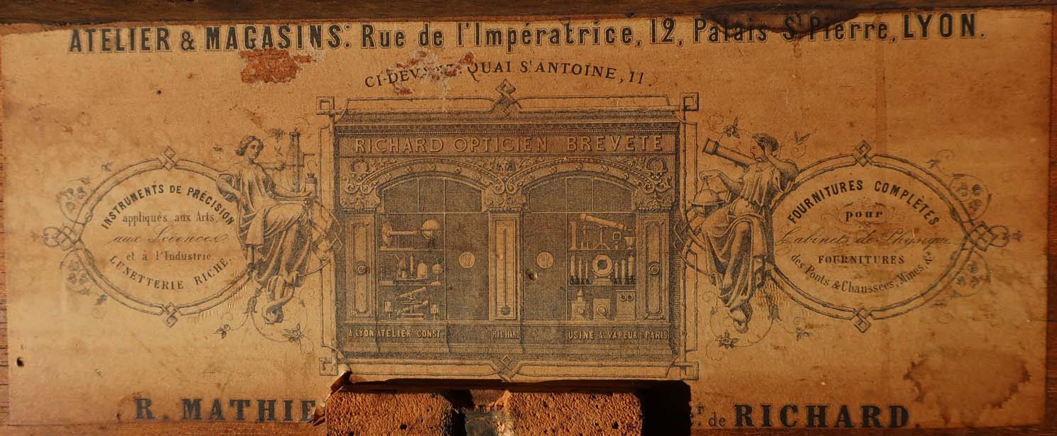 Ingénieur Opticien Breveté SGDG Constructeur d'instruments de précision appliqués aux sciences, aux arts et à l'industrie. Fournisseur des Hospices, des chemins de fer, de l'octroi et des subsistances militairesde Lyon. Médailles or et argent à diverses expositions. Spécialiste pour les laboratoires.