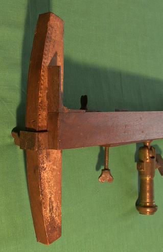 Construit en bois, les pièces métalliques et la visserie sont en fer. Seul le pied à douille avec rotule est en laiton. Deux traverses sont maintenues à une extrémité par une vis qui permet l'ouverture de l'angle. La mise en station nécessite un trépied à pointe. La traverse fixe est immobilisée par la pince de la rotule du pied à douille en position horizontale. Elle porte deux pinces à vis et deux petites calles pour maintenir une nivelle indépendante (manquante). Le réglage de cette nivelle est effectué par une vis qui joue sur une pièce à charnière fixée sous la traverse. La visée se fait an alignant l'objet à mesurer par le trou pratiqué dans la pièce en équerre fixée à une extrémité de la traverse mobile et la croisée de fils (restitués) de la pinnule située à l'autre extrémité. Le blocage de la traverse de visée en position sur le secteur circulaire s'effectue avec la vis qui agit sur une pince. Un renfort métallique, épouse la forme du secteur circulaire, sur la face opposée aux graduations et permet de ne pas abîmer le bois. La lecture de la pente se fait sur les graduations qui sont manuscrites sur papier collé. Les graduations vont de 0 à 25 % de pente en plus et en moins. Ce appareil de trés bonne construction artisanale, est en assez bon état. Il date de 1850 environ.
