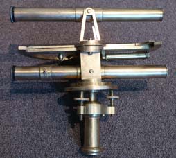 laiton demi-cercle d 225 mm 180° gradué dans les deux sens avec + ou - 10° en plus 2 verniers opposés gradués au 1/30 2 nivelles réglables 70 mm sous le demi-cercle 2 lunettes 253 mm lunette supérieure sur étriers fixés sur alidade mise au point par tirage avec lumière, lunette inférieure montée par axe horizontal sur 2 montants du mouvement général réticule réglable mise au moint à vis boussole graduée 4x90° avec blocage de l'auguille h totale avec douille 235 mm trois vis calantes sous le cercle de mouvement général cranté d 90 mm fixation à douille |