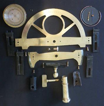 laiton h : 210 mm, largeur totale : 247 mm, 1/2 cercle diamètre : 223 mm, 4 pinnules à fente et fil, 2 verniers au 1/30, boussole diamètre : 70 mm, signature sur le pied à douille avec rotule trois fils de pinnule d'origine